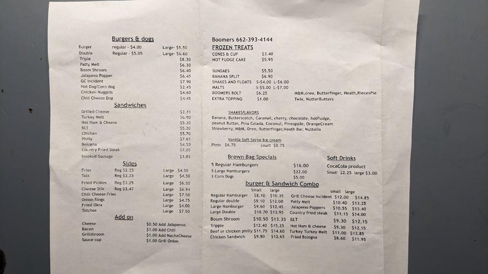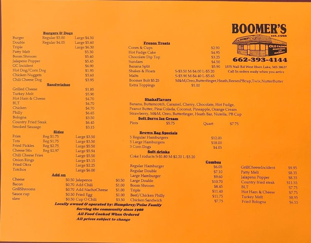 Welcome to BOOMERS, your go-to fast food destination in Horn Lake! Conveniently located at the corner of Hwy 51 and Nail Rd, across from the Citgo gas station, we specialize in mouthwatering burgers, local specialties, and delightful ice cream treats. Enjoy a quick lunch or dinner with our fast service, perfect for solo diners and groups alike. With a casual atmosphere and accessible amenities, BOOMERS welcomes everyone, including those with mobility needs. Dine in, take out, or use our drive-thru for extra convenience. Stop by today for a satisfying meal that won't break the bank!